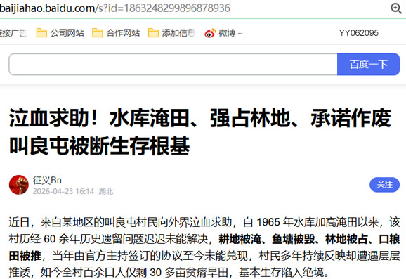 近日,来自某地区的叫良屯村民向外界泣血求助,自 1965 年水库加高淹田以来,该村历经 60 余年历史遗留问题迟迟未能解决,耕地被淹、鱼塘被毁、林地被占、口粮田被推,当年由官方主持签订的协议至今未能兑现,村民多年持续反映却遭遇层层推诿,如今全村百余口人仅剩 30 多亩贫瘠旱田,基本生存陷入绝境。