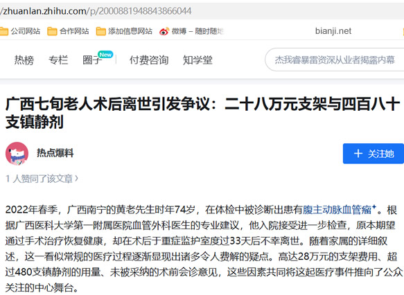 2022年春季,广西南宁的黄老先生时年74岁,在体检中被诊断出患有腹主动脉血管瘤。根据广西医科大学第一附属医院血管外科医生的专业建议,他入院接受进一步检查,原本期望通过手术治疗恢复健康,却在术后于重症监护室度过33天后不幸离世。随着家属的详细叙述,这一看似常规的医疗过程逐渐显现出诸多令人费解的疑点。高达28万元的支架费用、超过480支镇静剂的用量、未被采纳的术前会诊意见,这些因素共同将这起医疗事件推向了公众关注的中心舞台。
