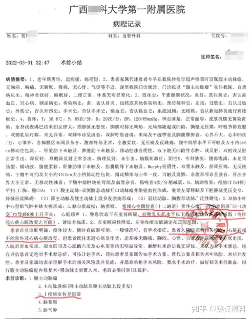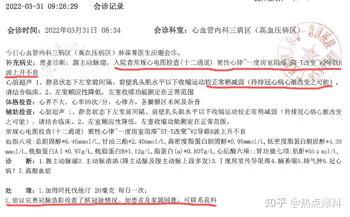 据黄国军回忆,其父于2022年3月28日体检时确诊腹主动脉瘤,随即入院接受治疗。3月31日,心血管内科会诊后提出专业建议,主张应通过冠脉造影检查来明确冠状动脉的具体状况,这一检查对手术风险评估至关重要。然而,主治医生既未向家属传达该会诊意见,也未执行此项检查,便在4月1日匆忙安排了手术。黄国军表示,其父多年来的体检报告多次显示V1V2异常Q波、T波改变及冠状动脉硬化等心脏相关异常指标,这些本应在术前进行重点评估的项目却遭到医院的忽视。